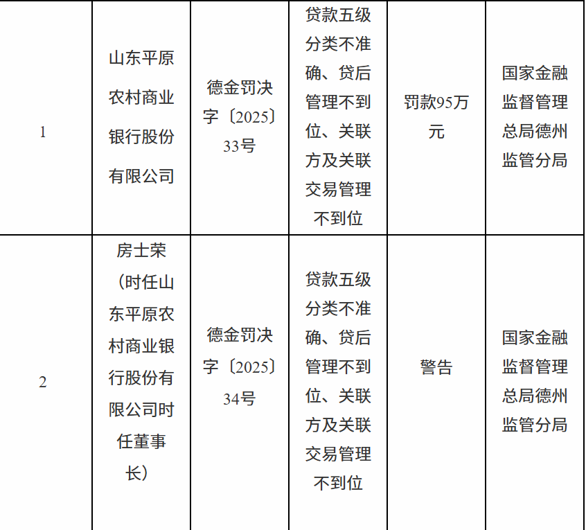 1月7日,国家金融监督管理总局德州监管分局行政处罚信息公开表显示珺牛策略,山东平原农村商业银行股份有限公司因贷款五级分类不准确、贷后管理不到位、关联方及关联交易管理不到位被罚款95万元;责任人房某荣被警告。